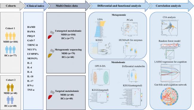 近日,西安交通大學(xué)馬現(xiàn)倉(cāng)/高媛團(tuán)隊(duì)在Translational Psychiatry上發(fā)表了題為:“Gut microbiota dysbiosis promotes cognitive impairment via bile acid metabolism in major depressive disorder”的文章。該文章通過(guò)對(duì)腸道微生物群落和膽汁酸代謝的詳細(xì)分析,揭示了MDD患者認(rèn)知功能下降的潛在機(jī)制。研究結(jié)果強(qiáng)調(diào)了“腸-膽汁酸-腦軸”在MDD中的重要性,并為未來(lái)的臨床研究和治療提供了新的思路。
