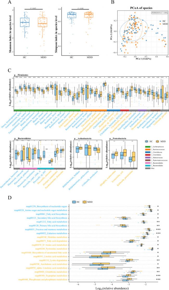為了了解腸道微生物群落是否在MDD中發(fā)生了變化,作者對(duì)79名MDD患者和60名健康對(duì)照組的糞便樣本進(jìn)行了宏基因組測(cè)序(Metagenomics)。分析顯示,MDD患者的腸道微生物多樣性發(fā)生改變。此外,MDD患者的腸道微生物群落結(jié)構(gòu)也發(fā)生了改變,表現(xiàn)出更高的不穩(wěn)定性。功能分析顯示,MDD患者通路的改變主要涉及初級(jí)膽汁酸生物合成、次級(jí)膽汁酸生物合成、氨基酸代謝,這些途徑與臨床癥狀和認(rèn)知功能相關(guān)。這些結(jié)果表明,MDD患者存在明顯的腸道微生物群落失衡現(xiàn)象,這種失衡可能是導(dǎo)致疾病發(fā)生或發(fā)展的原因之一。
