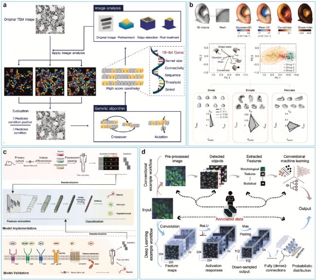如前所述,基質(zhì)凝膠材料的參與是構(gòu)建類器官的必要條件,這些材料的形態(tài)分析對其生物性能至關(guān)重要。傳統(tǒng)的方法通常需要人工識別和處理,這可能容易出錯,效率低下,而且很主觀,因此,需要引入AI?蓮倪@幾個生物學(xué)維度進行機器學(xué)習(xí)訓(xùn)練:形態(tài)學(xué)尺度圖像分析、細胞尺度圖像分析、類器官尺度的圖像分析、組織尺度的圖像分析。
