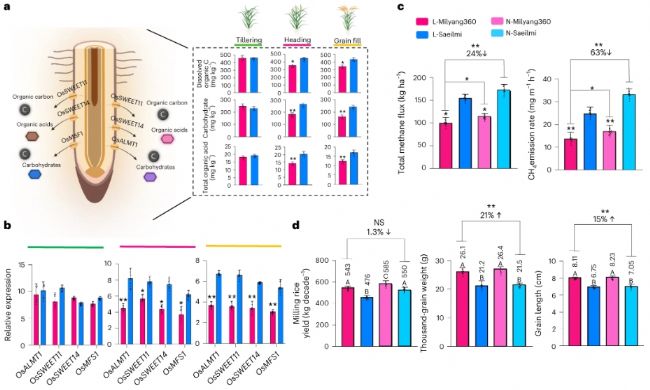 在本研究中,通過(guò)引入水稻品種Shindongjin的gs3突變體等位基因,開(kāi)發(fā)了一個(gè)近等基因系Milany360。這一基因系通過(guò)擴(kuò)大籽粒大小,將光合產(chǎn)物從根部轉(zhuǎn)移到籽粒,從而提高籽粒產(chǎn)量并降低甲烷通量。GS3基因是控制籽粒大小的基因,將光合產(chǎn)物更多的分配到籽粒,減少光合產(chǎn)物分配到根的比例,從而提高籽粒產(chǎn)量。