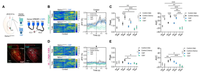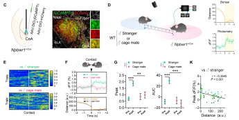 為進(jìn)一步研究CeA-NPBWR1神經(jīng)元在社交新穎性中的作用,研究人員構(gòu)建了NPBWR1-cre工具小鼠,通過光纖鈣成像系統(tǒng)發(fā)現(xiàn)在與陌生小鼠進(jìn)行接觸時(shí)CeA-NPBWR1神經(jīng)元鈣離子活性顯著增加,與陌生小鼠分開后這類神經(jīng)元群活性下降。在與熟悉小鼠進(jìn)行社交或者分離時(shí)這類神經(jīng)元群活性均未發(fā)生變化。