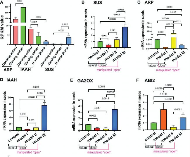 不同花粉授粉模型的評估結(jié)果顯示,IAAS、蔗糖合成酶(SUS)、赤霉素2-氧化酶(GA2ox)、ABA不敏感蛋白2(ABI2)和生長素抑制蛋白(ARP)這五個與休眠調(diào)控相關(guān)的標記基因在閉合阻斷花藥的花粉、低溫保護的花粉以及剛開裂花藥的花粉三種情況均表現(xiàn)出差異表達模式。閉合阻斷花藥處理導(dǎo)致IAAS、SUS、GA2ox和ABI2的表達顯著上調(diào),而ARP表達則顯著下調(diào),這表明閉合阻斷花藥處理傾向于延長種子休眠期。而在低溫保護的花藥模型中,SUS、ARP、GA2ox和IAAS的表達水平降低,ABI2表達上調(diào),總體上促進種子萌發(fā)。