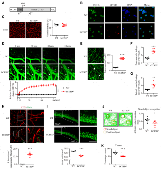 為了探討單核細(xì)胞CTSD上調(diào)對(duì)腦微血管的影響,研究者利用構(gòu)建了單核細(xì)胞表達(dá)人源CTSD的轉(zhuǎn)基因小鼠,命名為hCTSDhi(圖2A)。用CD31抗體對(duì)腦切片進(jìn)行免疫熒光染色,發(fā)現(xiàn)hCTSDhi小鼠腦微血管的密度和形態(tài)無(wú)明顯變化(圖2C)。研究者進(jìn)一步通過(guò)實(shí)時(shí)的雙光子活體成像實(shí)驗(yàn)評(píng)估小鼠腦微血管的血腦屏障的功能。在靜脈注射熒光示蹤劑后FITC-dextran后,研究者發(fā)現(xiàn)hCTSDhi小鼠的腦組織中可以觀察到在血管外示蹤劑進(jìn)行性積累的現(xiàn)象(圖2D),這表明hCTSDhi小鼠的腦血管對(duì)熒光示蹤劑滲漏。NeuN抗體免疫染色發(fā)現(xiàn)hCTSDhi小鼠海馬區(qū)神經(jīng)元密度顯著下降(圖2I)。同時(shí),新物體識(shí)別測(cè)試結(jié)果顯示hCTSDhi小鼠對(duì)新物體的探索減少(圖2J), Y迷宮實(shí)驗(yàn)發(fā)現(xiàn)hCTSDhi小鼠在獲得食物獎(jiǎng)勵(lì)的正確臂內(nèi)的停留的時(shí)間下降(圖2K),實(shí)驗(yàn)結(jié)果說(shuō)明hCTSDhi小鼠存在認(rèn)知記憶障礙。這些結(jié)果表明,單核細(xì)胞CTSD的高表達(dá)引起腦腦血管滲漏從而損傷神經(jīng)元,導(dǎo)致認(rèn)知記憶功能障礙。
