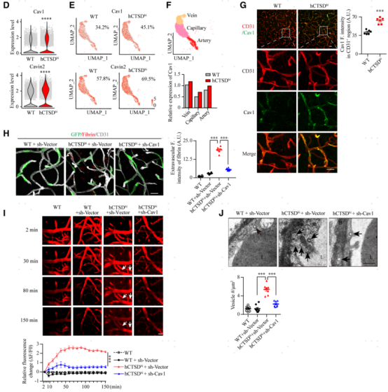 為了探討hCTSDhi小鼠腦血管內(nèi)皮細(xì)胞囊泡介導(dǎo)的轉(zhuǎn)胞吞增強(qiáng)的分子機(jī)制,研究者進(jìn)行hCTSDhi小鼠腦組織單細(xì)胞RNA測(cè)序分析。細(xì)胞聚類分析顯示,hCTSDhi小鼠腦內(nèi)內(nèi)皮細(xì)胞百分比略有變化(圖4A)。對(duì)內(nèi)皮細(xì)胞簇進(jìn)行差異基因分析,分析hCTSDhi小鼠腦血管內(nèi)皮細(xì)胞中發(fā)現(xiàn)29個(gè)上調(diào)基因和33個(gè)下調(diào)基因(圖4B)。基因集富集分析顯示,差異表達(dá)基因在內(nèi)吞途徑(頂部,圖4C)和小窩途徑(底部,圖4C)中顯著富集。在hCTSDhi小鼠腦內(nèi)皮細(xì)胞的差異表達(dá)基因中,發(fā)現(xiàn)小窩主要結(jié)構(gòu)成分Cav1 (caveolin 1)和Cavin2 (caveolae-associated protein 2)上調(diào),圖4D)。細(xì)胞群分析顯示,與野生型對(duì)照相比,hCTSDhi小鼠的Cav1+內(nèi)皮細(xì)胞增加的比例高于Cavin2+內(nèi)皮細(xì)胞增加的比例 (圖4E)。內(nèi)皮細(xì)胞群進(jìn)一步分為靜脈內(nèi)皮細(xì)胞、毛細(xì)血管內(nèi)皮細(xì)胞和動(dòng)脈內(nèi)皮細(xì)胞(上圖,圖4F),發(fā)現(xiàn)Cav1在hCTSDhi小鼠的3個(gè)內(nèi)皮亞群中均有升高,其中在毛細(xì)血管細(xì)胞中升高的比例尤其高(相比野生型小鼠,圖4F)。進(jìn)一步對(duì)腦切片進(jìn)行免疫染色,結(jié)果證實(shí)了hCTSDhi小鼠腦微血管中Cav1的表達(dá)增加(圖4G)。為了驗(yàn)證Cav1的上調(diào)導(dǎo)致hCTSDhi小鼠腦血管通透性升高,研究者用編碼shRNA-Cav1的AAV-BR1病毒特異性干擾內(nèi)皮細(xì)胞Cav1,然后進(jìn)行血管通透性分析。發(fā)現(xiàn)下調(diào)內(nèi)皮細(xì)胞Cav1后,hCTSDhi小鼠腦實(shí)質(zhì)纖維蛋白原沉積和熒光葡聚糖滲漏的現(xiàn)象明顯緩解了 (圖4H和4I)。進(jìn)一步的TEM分析顯示,hCTSDhi小鼠腦內(nèi)皮中囊泡的積聚的現(xiàn)象也減輕了。 (圖4J)。綜上所述,這些數(shù)據(jù)表明,外周單核細(xì)胞CTSD的上調(diào)增加了腦微血管內(nèi)皮細(xì)胞Cav1,促進(jìn)了囊泡介導(dǎo)的血腦轉(zhuǎn)胞吞作用,導(dǎo)致腦微血管通透性增加。