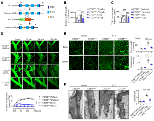 接下來(lái),研究者利用LoxP-Cre技術(shù)單倍敲除了小鼠單核細(xì)胞中的CTSD(構(gòu)建CTSDmKO小鼠),探討CTSD的下調(diào)是否對(duì)糖尿病相關(guān)的腦微血管損傷具有保護(hù)作用。通過(guò)qRT-PCR和ELISA檢測(cè)可見,CTSD的單倍敲降可以有效的將糖尿病模型小鼠單核細(xì)胞中和血漿中的CTSD水平控制在健康對(duì)照小鼠的水平(圖7B和7C)。接著研究者又使用FITC-葡聚糖(40 kDa)進(jìn)行了體內(nèi)雙光子腦成像,評(píng)估CTSD消除后糖尿病小鼠腦微血管的損傷情況。發(fā)現(xiàn)CTSDfl/fl對(duì)照糖尿病小鼠的血管周FITC-葡聚糖外滲明顯,而糖尿病CTSDmKO小鼠的腦實(shí)質(zhì)中這種外滲明顯減少(圖7D)。并且發(fā)現(xiàn)CTSD敲除也可以有效緩解糖尿病小鼠視網(wǎng)膜血管中FITC-葡聚糖的滲漏(圖7E)。透射電鏡分析顯示,糖尿病CTSDmKO小鼠腦血管內(nèi)皮細(xì)胞中囊泡的密度較糖尿病CTSDfl/fl小鼠也明顯下降(圖7F),這說(shuō)明CTSD的敲出有效緩解了糖尿病誘發(fā)的腦血管內(nèi)皮細(xì)胞轉(zhuǎn)胞吞增強(qiáng)的效應(yīng)。接著,研究者用NeuN抗體對(duì)腦片進(jìn)行免疫熒光染色,結(jié)果顯示糖尿病CTSDmKO小鼠海馬神經(jīng)元的丟失有所減輕(圖7G)。Y迷宮和新物體識(shí)別測(cè)試結(jié)果顯示,糖尿病CTSDmKO小鼠的記憶和認(rèn)知能力恢復(fù)顯著 (圖7H和7I)。這些結(jié)果表明,單核細(xì)胞CTSD的敲出可以有效治療糖尿病誘發(fā)的腦微血管滲漏并可以緩解糖尿病導(dǎo)致的認(rèn)知障礙。