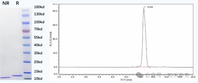 圖1:知禾泰克重組人白介素15 Recombinant Human IL-15 純度檢測(cè)結(jié)果,左圖:SDS-PAGE(NR,非還原,R,還原);右圖:SEC-HPLC