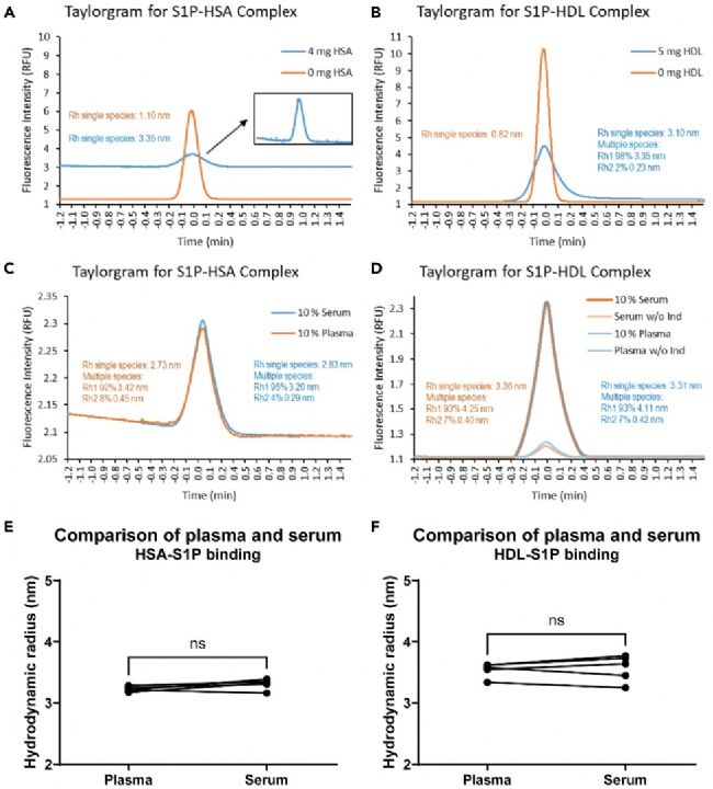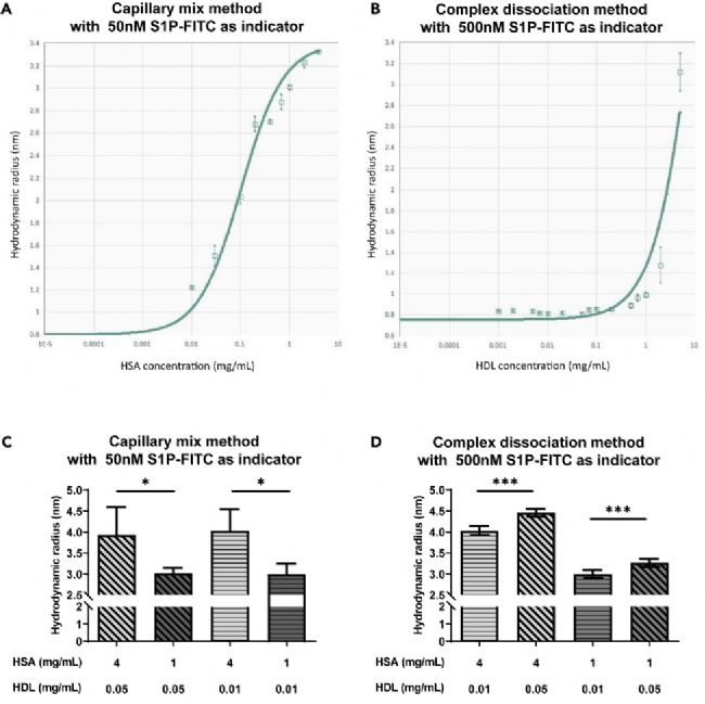 CapMix法:以50 nM S1P-FITC為指示劑,結(jié)果顯示無論HDL濃度如何,低濃度HSA都會導(dǎo)致流體動力學(xué)半徑(Rh)顯著下降,表明該方法測定的S1P-FITC與HSA的復(fù)合物形成具有濃度依賴性,且不受HDL濃度影響 。