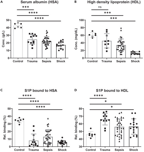 載體分子濃度:與對照組相比,患者血漿中 HSA 和 HDL 的濃度均顯著降低,感染性休克患者血漿中這兩種物質(zhì)的含量最低 。