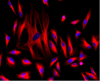 圖1.用小鼠抗微管蛋白染色HeLa細(xì)胞,再用iFluor647山羊抗小鼠IgG (H+L)(紅色)染色;細(xì)胞核用DAPI染色(藍(lán)色)。