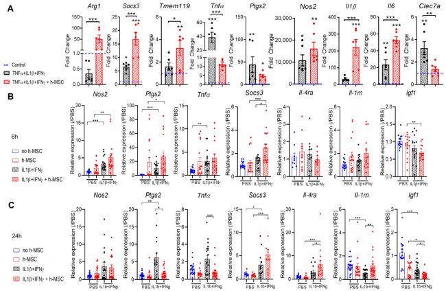 為了證實(shí)這些發(fā)現(xiàn),在體外小膠質(zhì)細(xì)胞培養(yǎng)物中量化了免疫調(diào)節(jié)標(biāo)志物、炎癥標(biāo)志物和抗炎標(biāo)志物的表達(dá)。數(shù)據(jù)表明,與從混合培養(yǎng)物中獲得的小膠質(zhì)細(xì)胞相比,h-MSCs 在體外小膠質(zhì)細(xì)胞對(duì)炎癥細(xì)胞因子的反應(yīng)中更快、更有效地抑制炎癥基因表達(dá),這與在大腦環(huán)境中缺乏抑制信號(hào)的情況下,小膠質(zhì)細(xì)胞在體外存活時(shí)間更長(zhǎng)的反應(yīng)性是一致的。