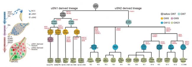 研究團隊通過解析人類DRG中感覺神經(jīng)發(fā)生和神經(jīng)元特化過程,發(fā)現(xiàn)嚴格的細胞發(fā)生順序是建立DRG復雜細胞類型的重要因素之一。感覺神經(jīng)元在不同的發(fā)育階段和譜系中的命運,是由外部信號和內(nèi)部轉錄因子的協(xié)同作用共同決定。