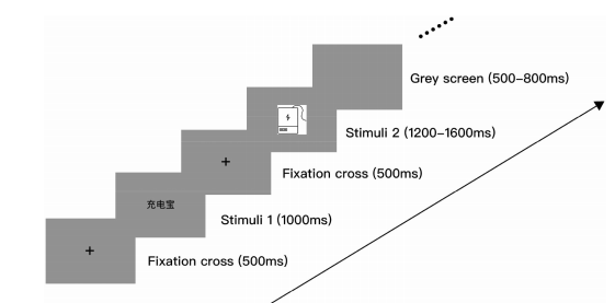 采用S1-S2范式。每次試驗(yàn)開(kāi)始時(shí),受試者注視屏幕中央500毫秒。隨后,在屏幕中央呈現(xiàn)一段文本S1(產(chǎn)品中文名稱(chēng)),持續(xù)1000 ms。然后,出現(xiàn)灰色屏幕,持續(xù)500 ms,然后是一個(gè)目標(biāo)S2(包括與S1匹配和不匹配的條件),持續(xù)時(shí)間1200-1600 ms(見(jiàn)圖2)。受試者被要求盡快用左手或右手食指按下相應(yīng)的鍵(文本與圖片一致按“Q”,不一致按“P”)。按鍵之后,出現(xiàn)隨機(jī)持續(xù)500 - 800ms的灰色屏幕,然后開(kāi)始新的試驗(yàn)。本實(shí)驗(yàn)為2(產(chǎn)品類(lèi)型:實(shí)用產(chǎn)品vs.娛樂(lè)產(chǎn)品)×3(抽象層次:低、中、高)實(shí)驗(yàn)設(shè)計(jì),共6個(gè)條件。