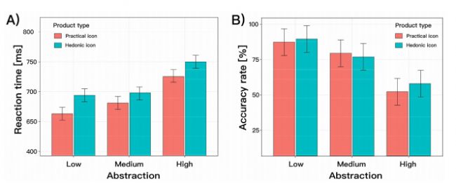 圖3 (A)表示受試者對(duì)低、中、高3種抽象層次的娛樂(lè)型和實(shí)用型產(chǎn)品圖標(biāo)的反應(yīng)時(shí)間;(B)分別表示受試者對(duì)低、中、高3種抽象層次的娛樂(lè)型和實(shí)用型產(chǎn)品圖標(biāo)的正確率。