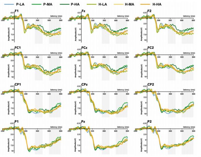 圖5 12個(gè)電極(F1, Fz, F2, FC1, FCz, FC2, CP3, CPz, CP4, P1, Pz, P2)的平均ERP波形,描述了6種實(shí)驗(yàn)條件,分別用6種顏色表示。P-LA(抽象程度較低的實(shí)用產(chǎn)品圖標(biāo))、P-MA(抽象程度中等的實(shí)用產(chǎn)品圖標(biāo))、P-HA(抽象程度較高的實(shí)用產(chǎn)品圖標(biāo))、H-LA(抽象程度較低的娛樂(lè)產(chǎn)品圖標(biāo))、H-MA(抽象程度中等的娛樂(lè)產(chǎn)品圖標(biāo))、H-HA(抽象程度較高的娛樂(lè)產(chǎn)品圖標(biāo))