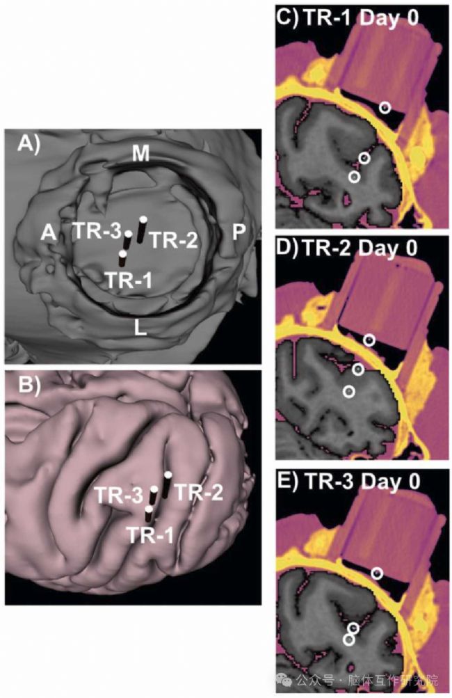 研究人員選用1只19歲、13.5 kg的成年雄性恒河猴作為研究對象進行實驗,為了確定皮質(zhì)神經(jīng)遞質(zhì)的濃度,使用CMA 12 Elite探針從位于上顳溝后岸的 MT 區(qū)域的三個不同位置(TR-1、TR-2、TR-3)(圖3 A)采集細胞外液樣本進行實驗。該研究采用新方法,即通過可拆卸插入物半慢性植入 MD 導(dǎo)管和探針。該插入物由生物相容性樹脂 3D 打印而成,放置在標(biāo)準(zhǔn) PEEK (聚醚醚酮)記錄室內(nèi),其結(jié)構(gòu)設(shè)計有助于固定導(dǎo)頭、清潔腔室和防止探針位移。MD 導(dǎo)管由聚氨酯制成,帶可拆卸尖頭不銹鋼針,MD 探針為定制不銹鋼軸,探針半透膜由 PAES 制成,可確保采樣穩(wěn)定。通過使用插入物將探針半慢性植入目標(biāo)區(qū)域后,利用注射泵裝置,把 aCSF泵入入口管,選擇 1 μL/min 的灌注速率進行灌流,以此平衡時間分離度和分析物回收率。該實驗12min收集一次樣品,樣品收集完成后使用MRI 掃描驗證探針位置后對樣本進行檢測分析。