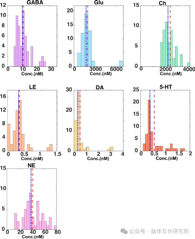 研究人員通過對細胞外液中神經(jīng)遞質(zhì)濃度值的額外分析,進一步驗證了在恒河猴 MT 區(qū)域采樣和檢測神經(jīng)遞質(zhì)的方法,并展示了 “活躍” 和 “非活躍” 狀態(tài)下 GABA、谷氨酸等神經(jīng)遞質(zhì)及膽堿濃度的頻率直方圖。