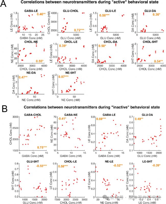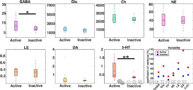 后續(xù)進一步計算了每種神經(jīng)遞質(zhì)在不同行為狀態(tài)下的變異系數(shù)(CV)并針對每個樣本,計算各神經(jīng)遞質(zhì)對之間的 Spearman 相關(guān)性,以此探究神經(jīng)遞質(zhì)的共調(diào)節(jié)和動態(tài)相互作用。結(jié)果顯示 “活躍” 狀態(tài)下的 CV 值始終高于 “不活躍” 狀態(tài),這可能反映出恒河猴在 “活躍” 狀態(tài)下行為表現(xiàn)的變異性更大,而 “不活躍” 狀態(tài)相對穩(wěn)定、喚起水平較低;“活躍” 狀態(tài)時,多巴胺、膽堿、去甲腎上腺素、谷氨酸和血清素等神經(jīng)遞質(zhì)間存在顯著正相關(guān),意味著這些神經(jīng)遞質(zhì)的濃度變化具有一致性,可能共同參與并依賴于猴子的任務(wù)執(zhí)行和行為表現(xiàn);“不活躍” 狀態(tài)下,GABA 與其他神經(jīng)遞質(zhì)存在顯著相關(guān)性,其中與膽堿、腎上腺素呈強正相關(guān),與去甲腎上腺素呈強負相關(guān),表明 GABA 在 “不活躍” 狀態(tài)下對其他神經(jīng)遞質(zhì)的調(diào)節(jié)作用突出,反映出該狀態(tài)下神經(jīng)元活動的抑制性調(diào)制增強。