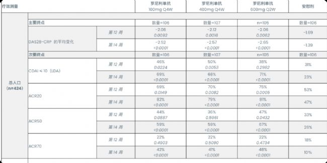 (圖片來源:ANAB官網(wǎng)PPT)本次臨床IIb期試驗(yàn)在臨床人數(shù)上已經(jīng)達(dá)到了III期人數(shù)的水平:共招募了400余名患者,平均氛圍四組:每四周(Q4W) 100 毫克皮下注射羅尼利單抗、每四周400毫克皮下注射、每兩周 600 毫克皮下注射 (Q2W) 以及安慰劑治療;患者的評分上,平均基線DAS-28 CRP)評分為5.64。