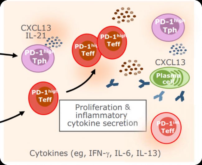 這是T細(xì)胞與PD-1最底層的邏輯,之后我們再垂直細(xì)分到自免/炎癥情況之下,這里需要明確底層邏輯,自免是免疫效應(yīng)太過強(qiáng)烈,如果PD-1能夠?qū)細(xì)胞激活,使其免疫受到抑制,自身免疫系統(tǒng)殺傷身體組織的情況就能得到緩解。而PD-1優(yōu)先表達(dá)于介導(dǎo)自身免疫病理的活化的Teff和Tfh/Tph細(xì)胞上。Teff即效應(yīng)T細(xì)胞,負(fù)責(zé)分泌炎癥因子,使得組織損傷,炎癥持續(xù)。Tfh是T濾泡輔助細(xì)胞,Tph是T外周輔助細(xì)胞,二者起的主要作用是分泌CXCL13和IL-21,招募B細(xì)胞并誘導(dǎo)其活化成為漿細(xì)胞,然后發(fā)揮的就是眾所周知的體液免疫過程了。