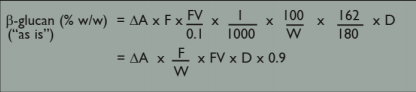 注:對(duì)于含有低水平 β-葡聚糖的麥芽汁樣品,請(qǐng)用 β-葡萄糖苷酶孵育較大等份的樣品溶液(最多 0.5 mL), 對(duì)空白組也應(yīng)使用這個(gè)更大的等份容量。同時(shí),D-葡萄糖標(biāo)準(zhǔn)液也必須用蒸餾水進(jìn)行相應(yīng)調(diào)整,并相應(yīng)地修改計(jì)算。
