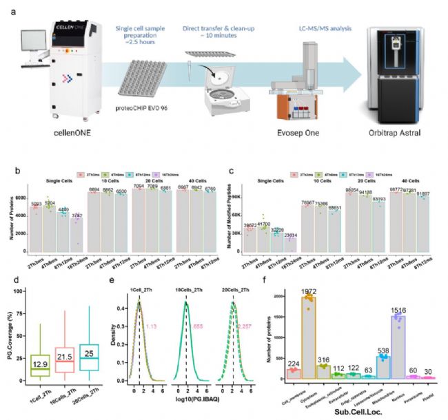 (A) 單細(xì)胞分離和蛋白質(zhì)組學(xué)處理工作流程的示意圖。(B) 使用不同的 nDIA 設(shè)置在單個(gè)、10 個(gè)、20 個(gè)和 40 個(gè) HeLa 細(xì)胞中鑒定的蛋白質(zhì)數(shù)量。(C) 使用不同的 nDIA 設(shè)置在單個(gè)、10 個(gè)、20 個(gè)和 40 個(gè) HeLa 細(xì)胞中鑒定的肽段數(shù)量。(D) 單細(xì)胞、10 細(xì)胞和 20 細(xì)胞樣品的蛋白質(zhì)序列覆蓋百分比。(E) 顯示不同細(xì)胞數(shù)量下定量范圍和一致性的 iBAQ 值分布。(F) 細(xì)胞區(qū)室中蛋白質(zhì)定位的概述。搜索使用了 Spectronaut(v18)