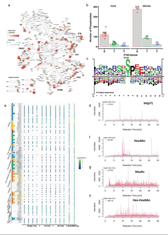(A) 激酶組樹狀圖,展示了單細(xì)胞中主要激酶家族的 168 種激酶的定量情況,節(jié)點(diǎn)顏色和大小表示 iBAQ 豐度。(B) 柱狀圖,描繪了單細(xì)胞和 20 細(xì)胞樣品中鑒定的絲氨酸(S)、蘇氨酸(T)和酪氨酸(Y)殘基的磷酸化位點(diǎn)數(shù)量。(C) 序列標(biāo)志分析,說明了在單細(xì)胞樣品中鑒定的最常見的磷酸化基序。(D) 磷酸酪氨酸(m/z 216.0426)的亞銨離子在液相色譜洗脫曲線中的提取離子色譜圖(XIC)。(E) 單細(xì)胞中鑒定的糖基因的可視化。(F) HexNAc(m/z 204.087)的氧鎓離子的 XIC,表明聚糖在 MS2 光譜中的存在。(G) NeuAc(m/z 274.092)的氧鎓離子的 XIC,反映了聚糖在 MS2 光譜中的豐度。(H) 二糖 Hex-HexNAc(m/z 366.139)的氧鎓離子的 XIC,反映了聚糖在 MS2 光譜中的豐度