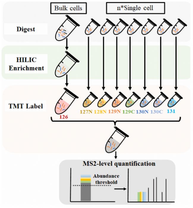 鑒于N-糖基化在諸多惡性腫瘤和其他疾病進(jìn)展中的重要性,在單細(xì)胞分辨率下闡明 N-糖基化模式的變化,將極大地促進(jìn)對(duì)其在腫瘤微環(huán)境和免疫治療中關(guān)鍵作用的理解?紤]到單細(xì)胞/微量細(xì)胞中樣本量極少且與富集方法不兼容,國家蛋白質(zhì)科學(xué)中心(北京)的秦偉捷研究員課題組開發(fā)了一種基于 TMT 標(biāo)記的完整N-糖肽分析非富集策略(圖4)。該策略并非依賴于單個(gè)單細(xì)胞/微量細(xì)胞樣品中完N-糖肽響應(yīng)較差的 MS信號(hào)強(qiáng)度,而是將使用從大量細(xì)胞樣品中獲得的N-糖肽的TMT 載體通道與TMT研究通道中的單細(xì)胞/微量細(xì)胞混合,且不進(jìn)行富集,以獲得組合的 MS1 信號(hào)。通過這種方式,研究通道可以避免富集步驟中的樣品損失,從而支持在極少量樣品中進(jìn)行超靈敏的 N-糖肽鑒定。即使在單細(xì)胞/微量細(xì)胞中非糖肽的干擾下,N-糖肽顯著提高的 MS1 信號(hào)也能有效地觸發(fā) MS/MS 裂解,從而促進(jìn)了對(duì)單個(gè)以及50 個(gè) HeLa 細(xì)胞的首次大規(guī)模定量完整N-糖蛋白組分析。由于單細(xì)胞 / 微量細(xì)胞樣品未進(jìn)行富集步驟,該策略不受不同糖型和豐度的 N - 糖肽之間富集效率差異的影響,因此可能導(dǎo)致更準(zhǔn)確的定量結(jié)果。