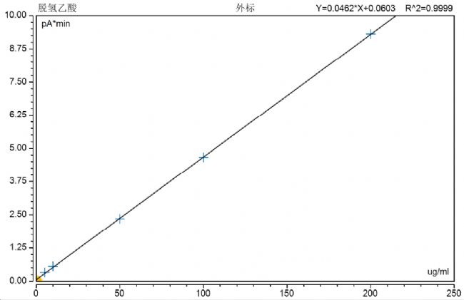 將脫氫乙酸標(biāo)準(zhǔn)工作液分別注入氣相色譜儀中,測定相應(yīng)峰面積,以標(biāo)準(zhǔn)工作液的濃度為橫坐標(biāo),峰面積為縱坐標(biāo),繪制校準(zhǔn)曲線。