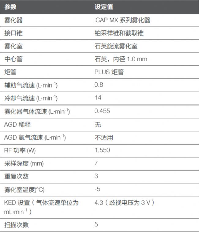 為了減少等離子體中有機(jī)溶劑產(chǎn)生的高蒸汽壓影響,并且能在一個(gè)序列中分析各種類型的樣品,將霧化室冷卻到-5℃。