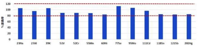 每隔10個(gè)樣品就分析一次質(zhì)控樣品(QC),以驗(yàn)證整個(gè)分析批間的分析準(zhǔn)確度,進(jìn)行了10小時(shí)的連續(xù)分析,并對(duì)QC進(jìn)行了檢測(cè),平均準(zhǔn)確率如圖3所示,所有元素的平均準(zhǔn)確率都在80%-120%的范圍內(nèi),相對(duì)標(biāo)準(zhǔn)偏差小于5%,有力地證明了長期采集的數(shù)據(jù)具備較高的準(zhǔn)確性和精確性。