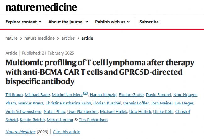 Braun T, Rade M, Merz M, Klepzig H, Große F, Fandrei D, Pham NN, Kreuz M, Kuhn CK, Kuschel F, Löffler D, Meinel J, Heger E, Schweinsberg V, Pflug N, Platzbecker U, Hallek M, Holtick U, Köhl U, Scheid C, Reiche K, Herling M, Richardson T. Multiomic profiling of T cell lymphoma after therapy with anti-BCMA CAR T cells and GPRC5D-directed bispecific antibody. Nat Med. 2025 Feb 21. doi: 10.1038/s41591-025-03499-9. Epub ahead of print. PMID: 39984633.
