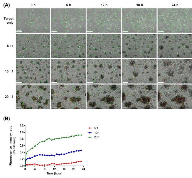 - 熒光標(biāo)記細(xì)胞: GFP-H2B靶細(xì)胞的實(shí)驗(yàn)表明,隨著E:T比增加,紅熒光(死亡細(xì)胞)強(qiáng)度上升,綠熒光(活細(xì)胞)下降,且細(xì)胞聚集增多。