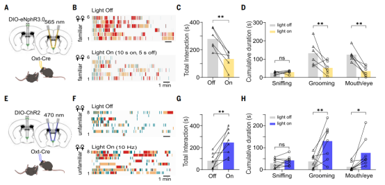 光抑制PVH腦區(qū)催產(chǎn)素神經(jīng)元清醒小鼠在與無意識同伴的理毛、口眼區(qū)域親密接觸行為減少,光激活這類神經(jīng)元群可促進上述親密接觸行為。側腦室注射催產(chǎn)素受體拮抗劑也能顯著降低親密接觸行為,表明PVH腦區(qū)催產(chǎn)素神經(jīng)元調控對無意識同伴小鼠的救助樣親社會行為。