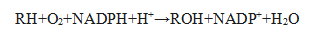 細胞色素P450(CytochromeP450,CYP450),屬于單加氧酶(momooxygenase),主要存在于滑面內(nèi)質(zhì)網(wǎng)的微粒體中,能催化烷烴、烯烴、芳烴和類固醇等多種物質(zhì)進行氧化反應(yīng)。該酶系由細胞色素P450和NADPH-細胞色素P450還原酶(以FAD為輔基的黃素蛋白)偶合組成,需要分子氧和還原輔酶Ⅱ(NADPH)參與反應(yīng),催化基本反應(yīng)為: