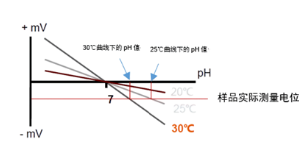 在進(jìn)行pH測(cè)量時(shí),標(biāo)準(zhǔn)緩沖液和樣品的溫度應(yīng)盡量保持一致。如果溫度偏差較大,pH值的誤差也會(huì)更加明顯。下圖展示了不同溫度下的校準(zhǔn)曲線差異,溫度偏差越大,誤差越明顯。