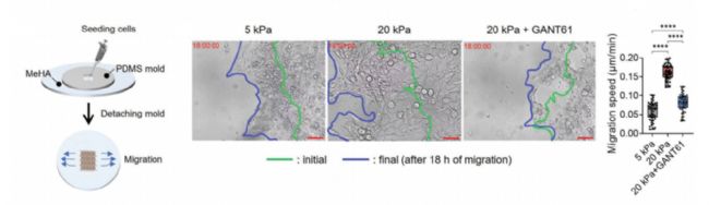 案例1:檀國(guó)大學(xué)組織再生工程研究所實(shí)驗(yàn)人員于2024年在《Advanced Science》期刊發(fā)表文章“Tissue Mechanics and Hedgehog Signaling Crosstalk as a Key Epithelial–Stromal Interplay in Cancer Development”[4]。在這篇文章中,團(tuán)隊(duì)人員在口腔/食管上皮發(fā)育不良過程中探究上皮細(xì)胞的增殖和遷移能力,通過JuLI™ Stage活細(xì)胞成像展示了在不同剛度水平的MeHA水凝膠上細(xì)胞遷移實(shí)驗(yàn)示意圖。結(jié)果表明對(duì) MeHA 水凝膠的集體遷移測(cè)定表明,HSC3 細(xì)胞在較硬的基材上遷移速度明顯更快。