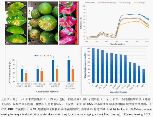 佛羅里達大學的研究人員使用高光譜成像技術檢測柑橘葉片和未成熟果實上幾個疾病發(fā)展階段(無癥狀、早期和晚期癥狀)的柑橘潰瘍病,這種疾病的無癥狀階段是治療樹木的關鍵時期。使用徑向基函數 (RBF)、K 最近鄰 (KNN)法對樣品進行識別,在RBF方法使用的植被指數中,水分指數 (WI) 和光化學反射指數(PRI)分別更準確地檢測了潰瘍病的無癥狀階段和早期階段。