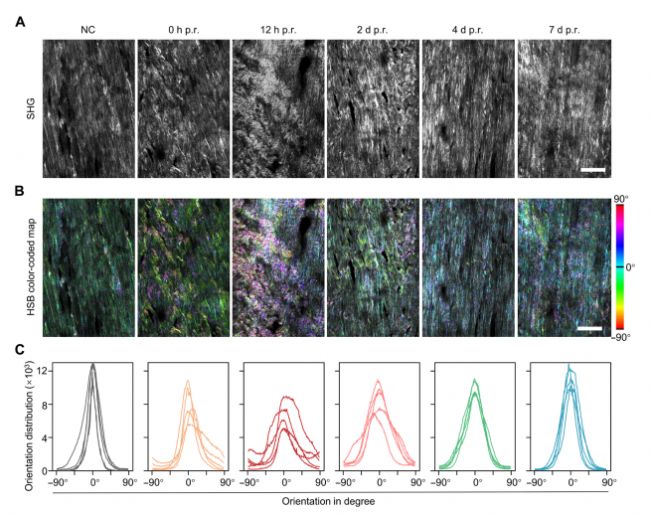 2, 膠原纖維組織恢復(fù):運(yùn)動(dòng)后膠原纖維紊亂,2 - 7天逐漸恢復(fù)正常排列。