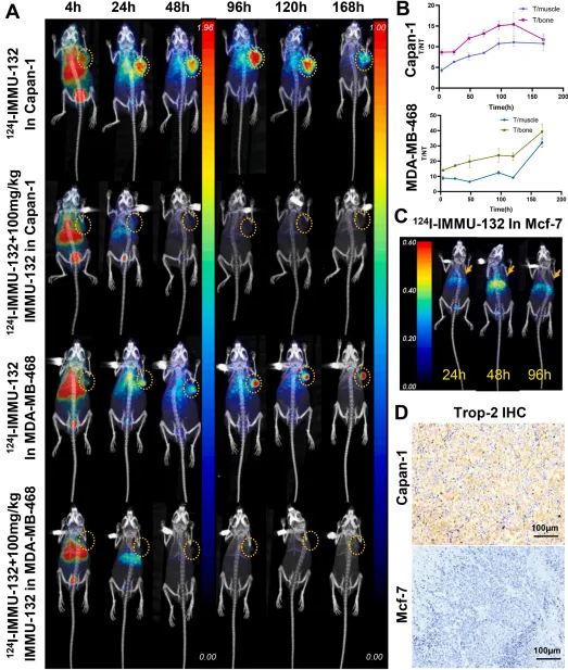 方法:本研究構建了一種新的靶向Trop-2的分子探針124I-IMMU-132,以更好地揭示Trop-2的表達。在Capan-1/MDA-MB-468/Mcf-7細胞及其動物模型中研究了探針對trop-2陽性腫瘤的靶向和結合能力。