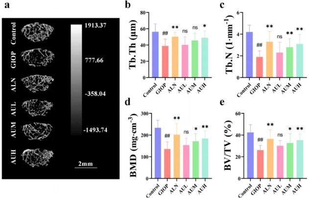 Micro-CT技術(shù)是一種靈敏可靠的定量和定性分析技術(shù),已被用于分析重塑骨的骨礦物質(zhì)含量和微觀結(jié)構(gòu)。GIOP組Tb.Th, Tb.N, BMD, and BV/TV顯著減少與OP病理特征一致,表明模型建立成功。AU干預(yù)顯著增加Tb.Th, Tb.N, BMD,和 BV/TV。表明AU增加GIOP小鼠的骨密度,促進骨形成,減少小梁微結(jié)構(gòu)破壞。