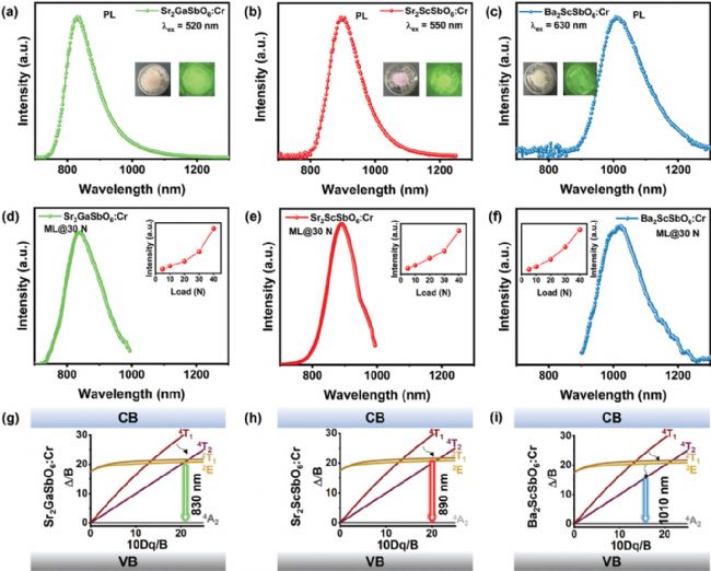 Sr2ScSbO6:Cr3+的可恢復性是在5 N的載荷下測量的,而Sr2GaSbO6:Cr2+和Ba2ScSbO6:Cr3+分別是在15和20 N的載荷上測量的,因為它們的ML強度較弱(圖3a-c)。盡管ML強度存在波動,特別是對于A/M=Sr/Ga和Ba/Sc,但沒有觀察到ML強度的顯著降低。三種摻雜Cr3+的銻酸鹽雙鈣鈦礦的ML強度和光譜分布在紫外線照射3分鐘前后沒有顯著變化(圖3d-f),表明這些樣品中的ML不需要預激發(fā),預激發(fā)對ML強度沒有顯著影響。
