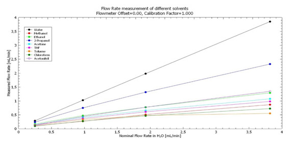 在技術(shù)研究報告中,用在純凈水中校準(zhǔn)的儀器,測量不同溶劑情況下的表觀流量,對HPLC流量計性能有效性的證據(jù)進(jìn)行了評估。