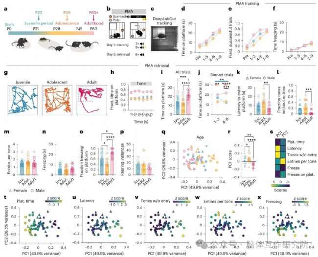 選取幼年(P23)、青少年(P35)和成年(P60 及以上)小鼠進行實驗,研究表明各年齡小鼠學習PMA的能力無差異,但在測試階段,幼年和青少年小鼠在威脅音下停留在平臺的時間較短,且青少年進入安全平臺更慢、次數(shù)更少。主成分分析(PCA)表明,不同年齡組的回避行為模式存在差異,組內(nèi)行為特征也不同。對照實驗證實,這些行為差異源于習得的威脅回避反應(yīng),而非其他干擾因素。
