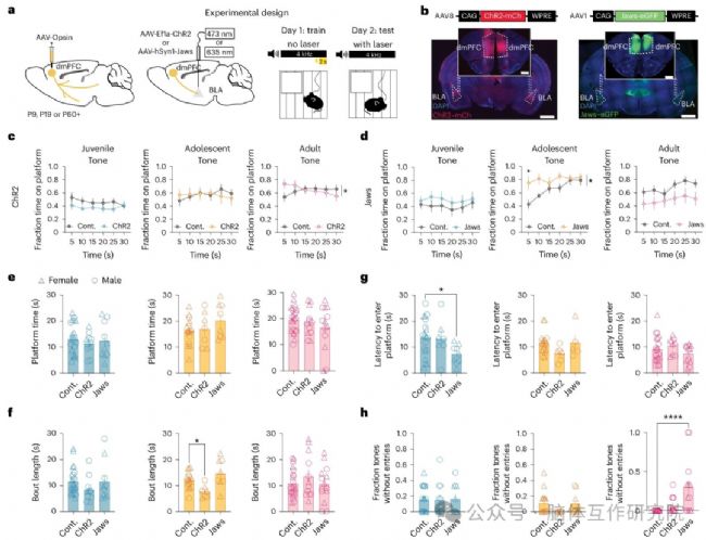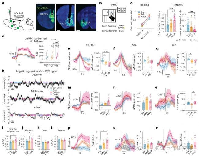 接著運用光纖光度法測量幼年、青少年和成年小鼠在 PMA 檢索期間 dmPFC、BLA 和 NAc 的神經(jīng)活動;使用邏輯回歸研究神經(jīng)活動與 PMA 行為之間的預(yù)測關(guān)系。向小鼠腦內(nèi)特定區(qū)域注入表達 GCaMP6s 的腺相關(guān)病毒(AAV),植入光纖,在 PMA 檢索過程中同步成像 GCaMP6s 和對照熒光,記錄神經(jīng)活動。之后通過邏輯回歸分析神經(jīng)活動與行為之間的關(guān)系。結(jié)果表明在PMA測試中,成年小鼠的dmPFC(背內(nèi)側(cè)前額葉皮層)對威脅信號反應(yīng)獨特:威脅音調(diào)出現(xiàn)時活動激增,進入安全平臺后則快速降低,且其活動能更精準預(yù)測威脅與安全環(huán)境。此外,成年小鼠退出平臺時BLA(基底外側(cè)杏仁核)的神經(jīng)活動明顯高于青少年,表明不同年齡組的探索行為存在神經(jīng)機制差異。