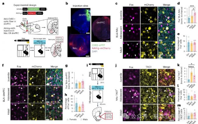 通過注射表達 ChR2 - 增強黃色熒光蛋白的 AAV 和逆行示蹤病毒,訓練小鼠進行 PMA,光遺傳刺激后免疫染色,量化 Fos 表達。結(jié)果發(fā)現(xiàn)成年小鼠中 Fos + BLA - NAc 細胞數(shù)量顯著高于青少年和幼年小鼠,表明激活 dmPFC 投射通過更強地激活 BLA - NAc 通路促進成年小鼠的回避行為。dmPFC 在青少年小鼠中與 NAc 中 TAC1 表達細胞的功能連接更強,可能導(dǎo)致其低回避水平。