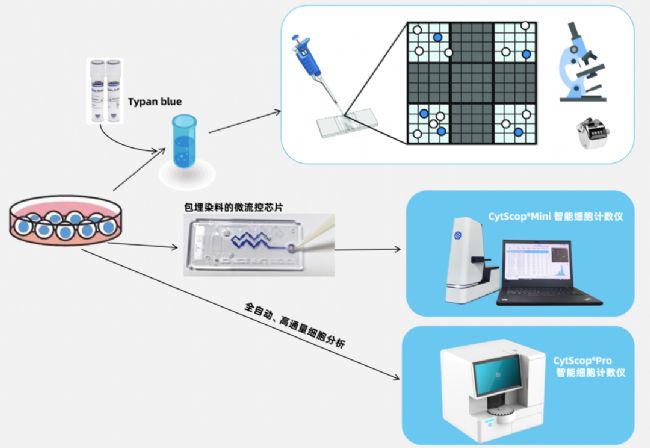 檢測設(shè)備流路精簡化:傳統(tǒng)細(xì)胞計數(shù)儀是在流動池里混勻臺盼藍(lán)染料,可能會出現(xiàn)流路污染,甚至頻繁更換流動池,將染料包埋于微流控芯片中,使得設(shè)備的流路更加精簡,從而增加計數(shù)的準(zhǔn)確性和降低儀器維護(hù)成本。