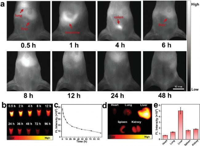 如圖4a所示,半小時(shí)內(nèi),CTB1125 NPs通過(guò)血液集中在小鼠的肺部,并在肝臟中部分富集。然后,大量的CTB1125 NPs被腸道吸收,在≈4小時(shí)內(nèi)到達(dá)結(jié)腸,隨后被排泄系統(tǒng)代謝。6小時(shí)后,剩余的CTB1125 NPs在肝臟中逐漸富集,并在8小時(shí)達(dá)到峰值。隨后,CTB1125 NPs逐漸被肝臟清除和代謝。特別是,在12小時(shí)內(nèi)可以清楚地觀察到小鼠的血管。