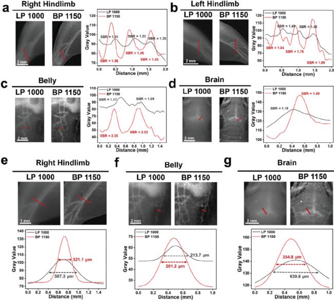 為了評(píng)估CTB1125 NPs在體內(nèi)成像的空間分辨率能力,用DMSO中的ICG溶液作為對(duì)照對(duì)BALB/c裸鼠的腹部和后肢進(jìn)行成像。使用1150 nm帶通濾光片的NIR-II成像顯示,在1.49到2.52之間的SBR比使用1000 nm長(zhǎng)通濾光片的SBR高得多(圖5a-d)。與此同時(shí),BP 1150濾光片只允許1125-1175 nm范圍內(nèi)的光通過(guò)。因此,來(lái)自背景的短波長(zhǎng)熒光信號(hào)被大大過(guò)濾。即使在較長(zhǎng)的曝光時(shí)間下,CTB1125 NPs的熒光信號(hào)也可以很好地與背景信號(hào)區(qū)分開(kāi)。此外,半峰全寬(FWHM)也用于評(píng)估不同濾光片下CTB1125 NPs的成像分辨率(圖5e-g)。當(dāng)量化同一位置的成像熒光強(qiáng)度時(shí),信號(hào)的高斯擬合曲線表明,使用1150nm帶通濾波器可以獲得更窄的FWHM。值得注意的是,由于顱骨皮膚組織較厚,使用BP 1150濾波器對(duì)腦血管進(jìn)行成像時(shí),F(xiàn)WHM可以從639.6µm顯著降低到354.8µm,從而顯著提高了成像質(zhì)量。所有結(jié)果表明,在0.3 W cm−2的低功率激光輻射和不超過(guò)150 ms的曝光時(shí)間下,僅注射200µL 50µM CTB1125 NPs即可獲得高清晰度和分辨率的圖像。