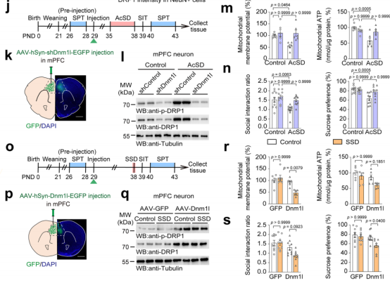 在青春期經(jīng)歷短期4天的社交挫敗應(yīng)激,結(jié)果發(fā)現(xiàn)約一半小鼠小鼠表現(xiàn)出應(yīng)激敏感性(存在嚴(yán)重的社交障礙),糖水消耗率也顯著降低。應(yīng)激敏感性小鼠內(nèi)側(cè)前額葉皮層(mPFC)腦區(qū)線粒體膜電位降低,ATP水平也減少。線粒體裂變抑制劑Mdivi1處理后可顯著改善應(yīng)激敏感性小鼠mPFC線粒體形態(tài)和功能障礙,并改善社交障礙和快感缺失癥狀。