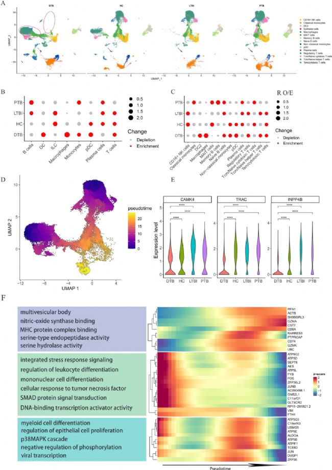 與健康對(duì)照組和其他結(jié)核病樣本相比,DTB樣本在UMAP圖中顯示的T細(xì)胞亞群分布存在顯著差異,這表明DTB患者的T細(xì)胞基因表達(dá)譜發(fā)生了獨(dú)特的變化(圖2A)。作者進(jìn)一步分析了T細(xì)胞中表達(dá)量最高的十個(gè)基因(圖1D),例如CAMK4、TRAC和INPP4B,發(fā)現(xiàn)這些基因在DTB樣本中的表達(dá)水平顯著降低(圖2E)。為了量化各細(xì)胞亞群與疾病的相關(guān)性,作者采用了觀察值與預(yù)期值的細(xì)胞比例(R o/e)進(jìn)行分析。結(jié)果顯示,巨噬細(xì)胞和單核細(xì)胞的R o/e比例傾向于與DTB相關(guān),而細(xì)胞毒性T細(xì)胞和記憶B細(xì)胞則表現(xiàn)出相反的趨勢(shì)(圖2B、C)。鑒于DTB患者T細(xì)胞獨(dú)特的基因表達(dá)譜,作者進(jìn)一步進(jìn)行了偽時(shí)間分析,將從初始T細(xì)胞到細(xì)胞毒性T細(xì)胞的分化過程定義為時(shí)間順序。許多基因在偽時(shí)間分析中表現(xiàn)出高度的變異性,其中大多數(shù)基因的表達(dá)量隨著偽時(shí)間的推移在DTB患者中逐漸降低(圖2D、圖2F)。這一結(jié)果表明,隨著細(xì)胞分化的進(jìn)行,基因表達(dá)水平顯著下降,這暗示了T細(xì)胞可能發(fā)生了功能耗竭。